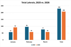 While 58 partner and counsel moves were reported in March, the same as in February, the total was significantly lower than in March 2025. As a result, the number of lateral moves so far in 2026 trails the number for the first three months of 2025.