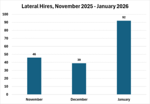 January was a particular active month for lateral hiring in DC, as 92 partner and counsel moves were reported, up from 39 in December. The number is also significantly higher than the 57 moves reported in January 2025.